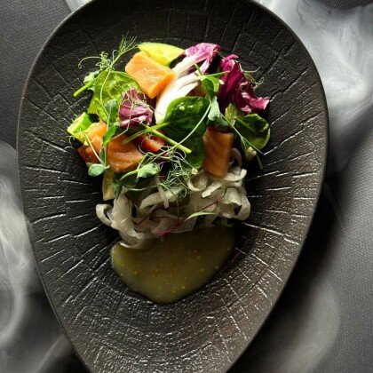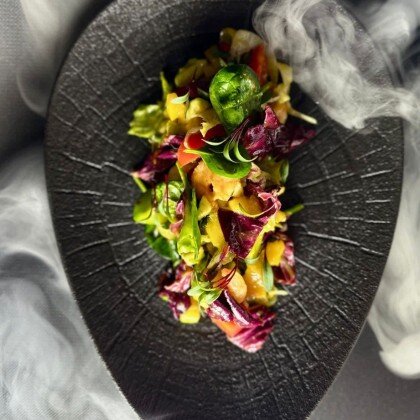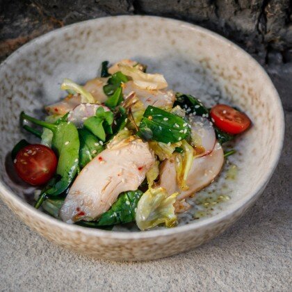 Шпинат, цукини, огурец, морковь, говяжий язык, каперсы, горчица дижонская, перец халапеньо, кунжут,кедровый орех, соус сладкий чили